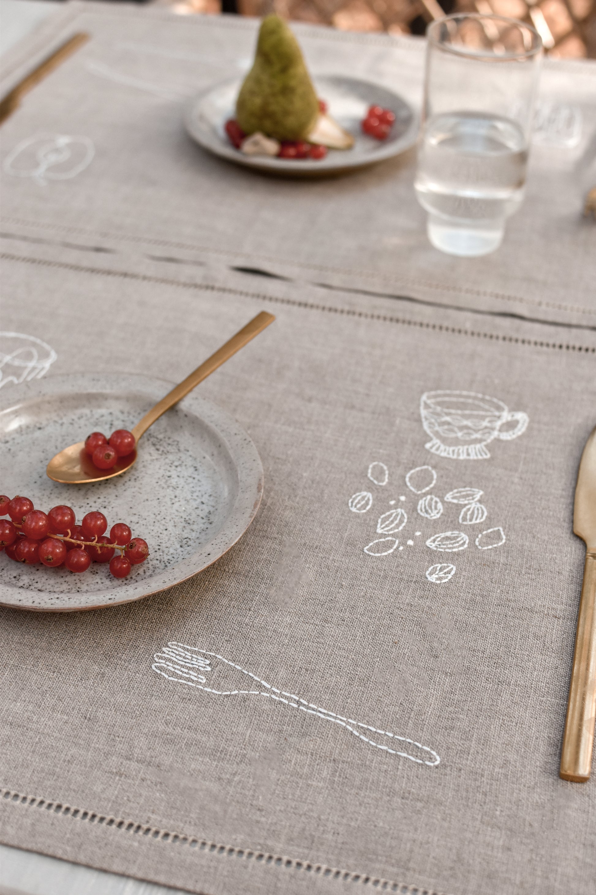 Les sets de table sont entièrement réalisés à la main par nos soins, de la couture, en passant par la réalisation d'une bordure décorative, jusqu'à la broderie réalisée à la main.