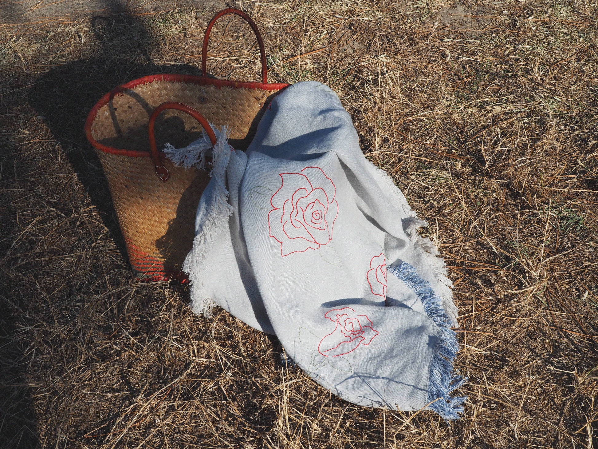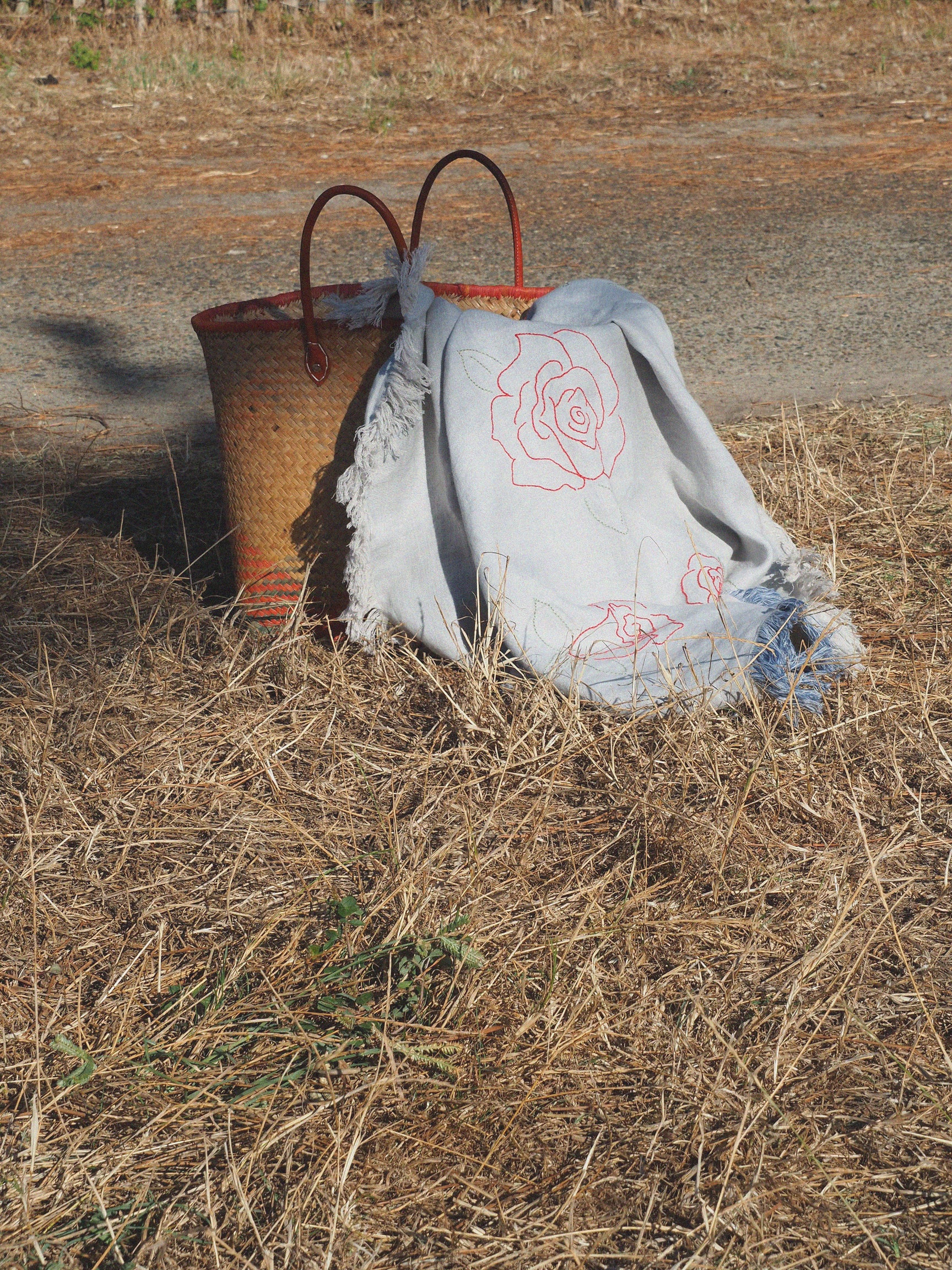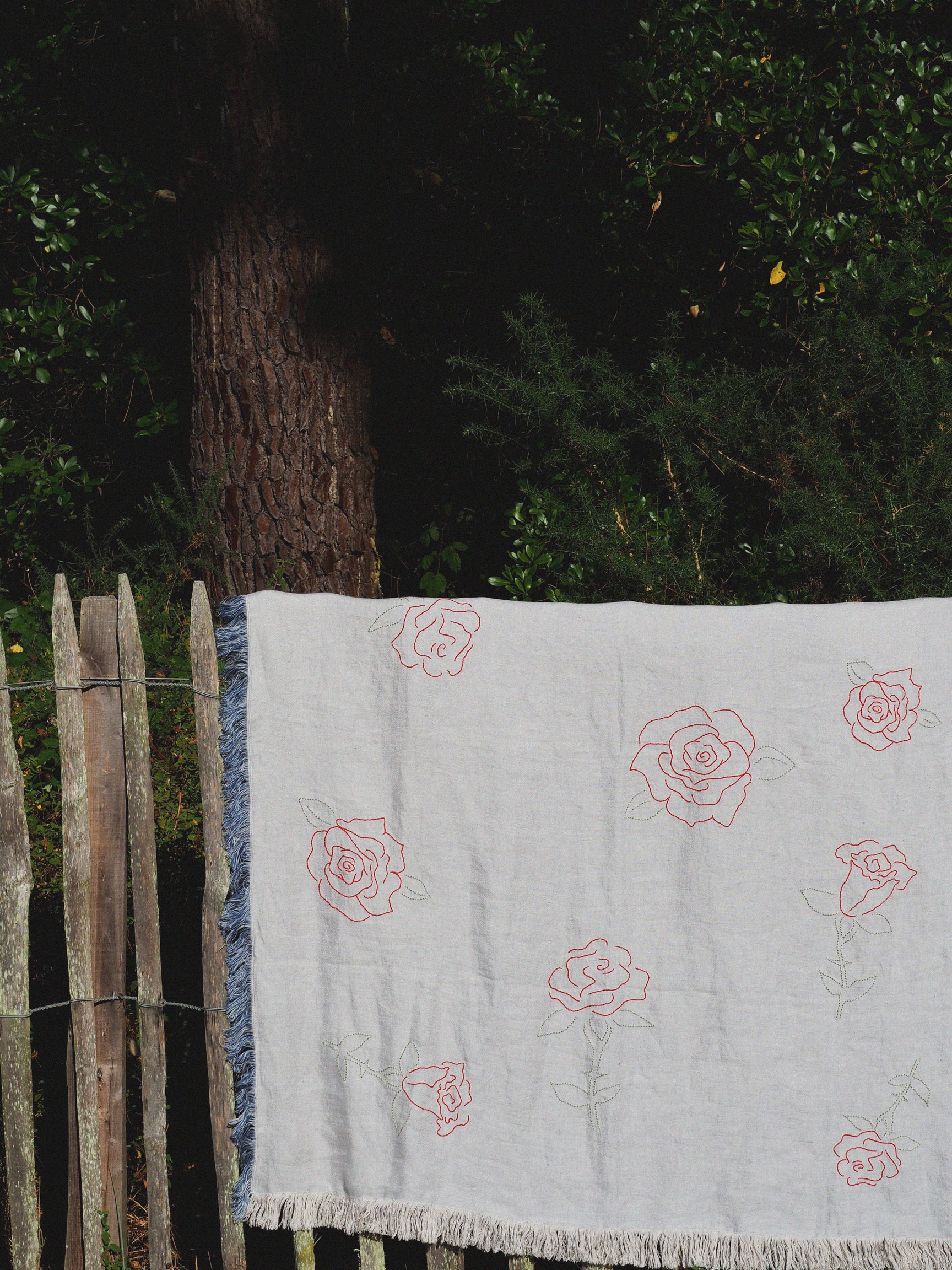 Élégance discrète et savoir-faire artisanal se rencontrent dans ce plaid d’exception, confectionné entièrement à la main à partir de lin lavé 100 % biologique. Sa nuance bleu argenté, douce et lumineuse, évoque la quiétude d’un matin d’été voilé de brume. Sur une seule face, une broderie délicate de roses, réalisée avec du fil de coton, apporte une touche poétique et intemporelle.