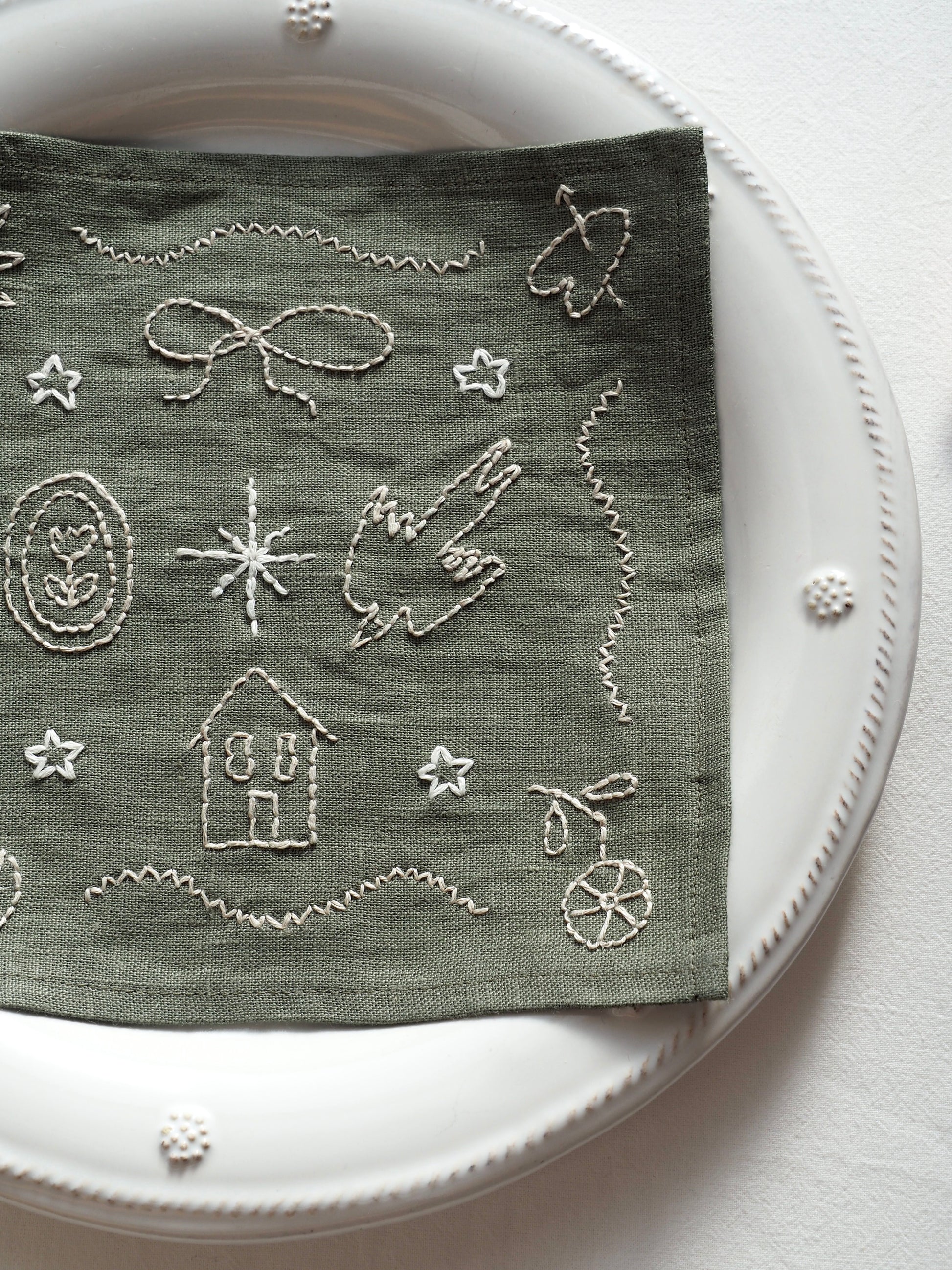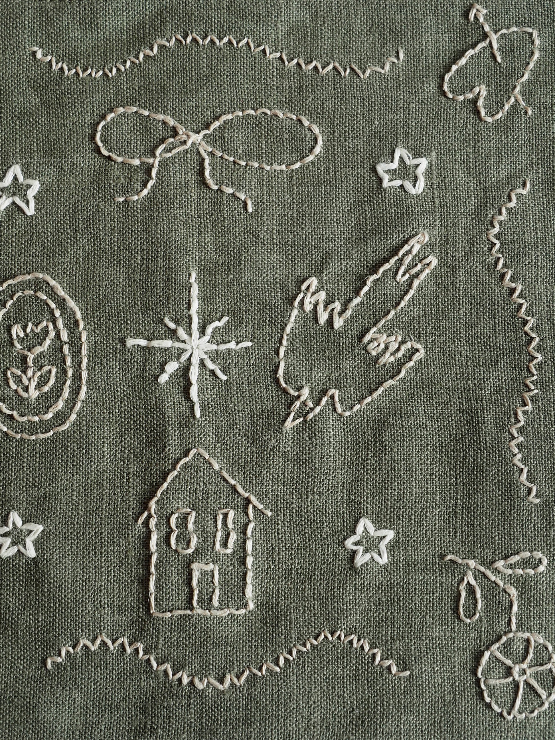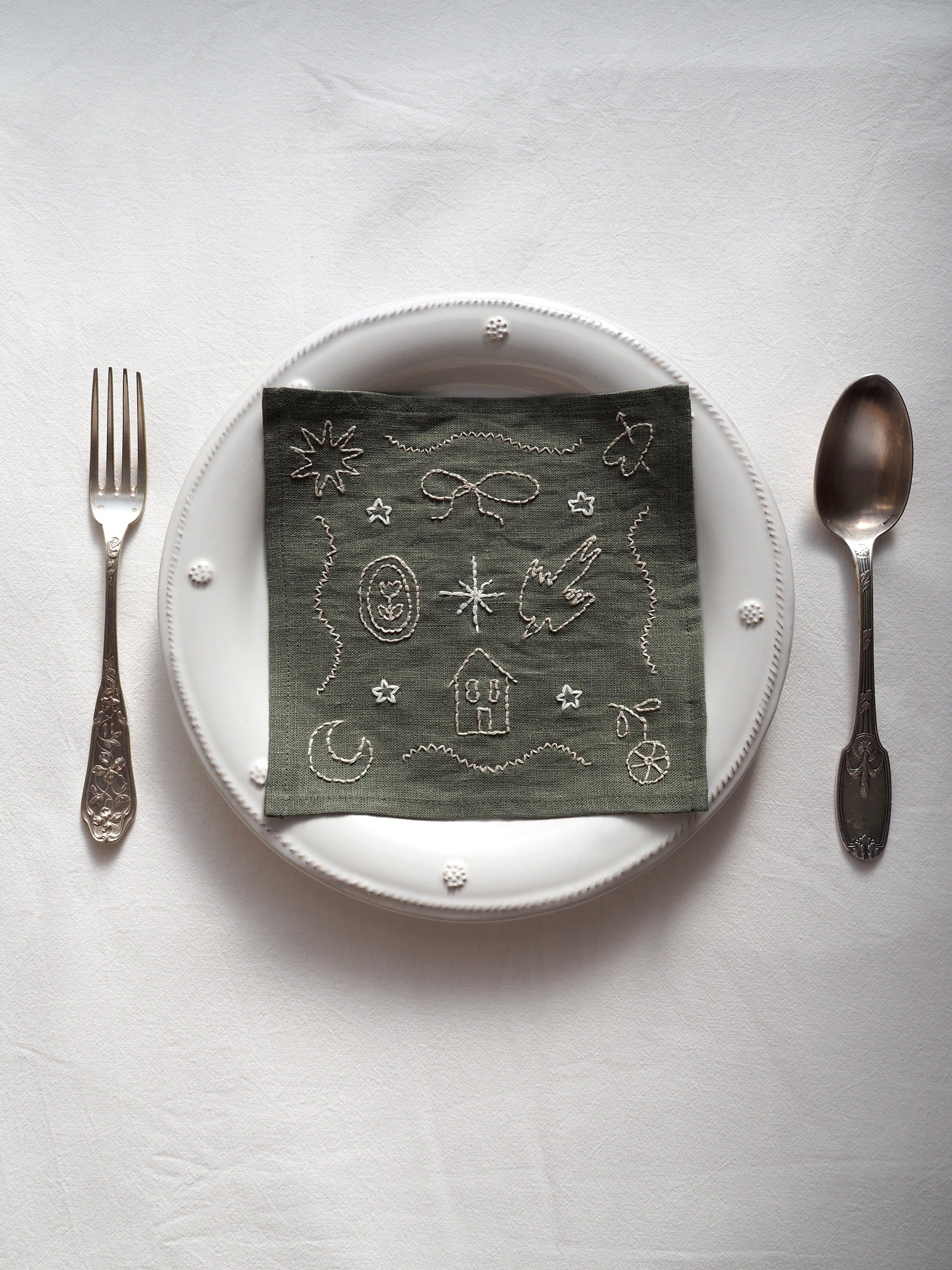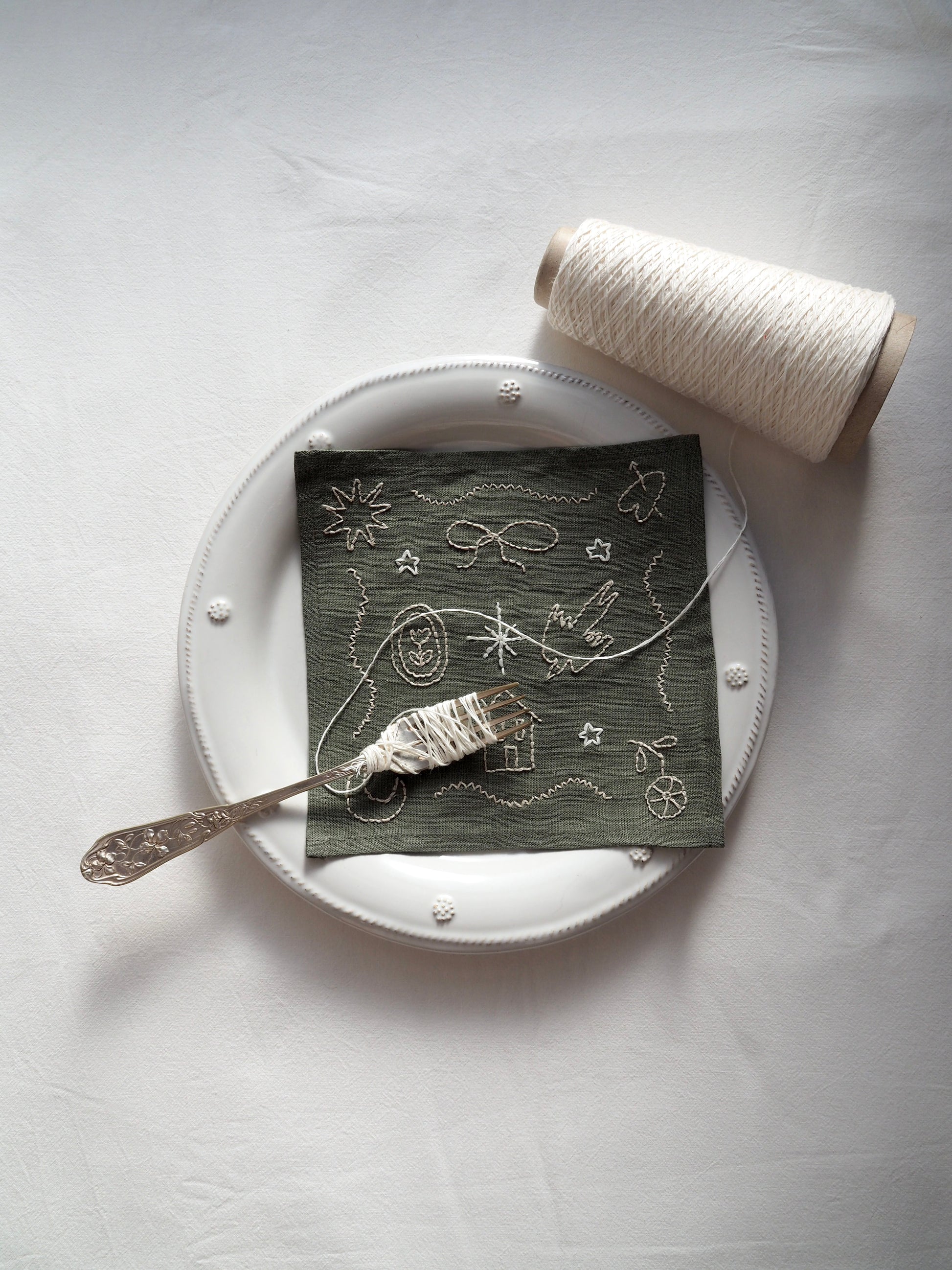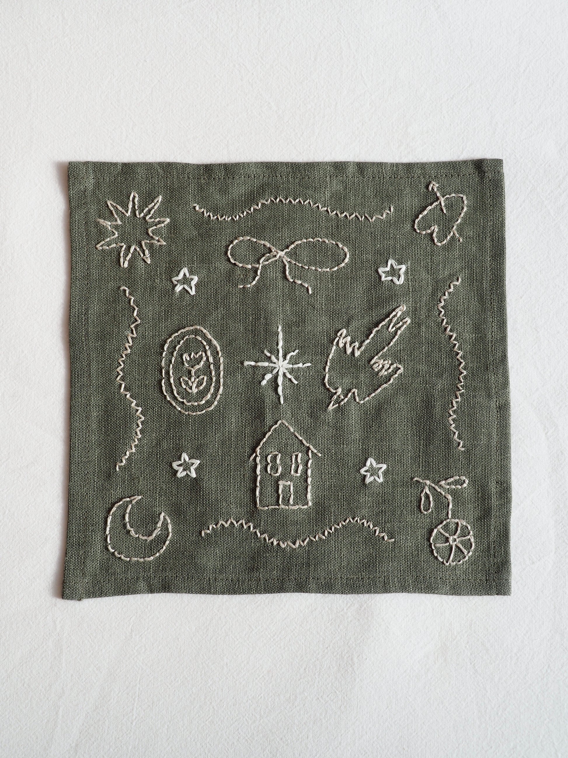 This small linen napkin is crafted from 100% organic linen, in a deep, earthy tone that gives the embroidery a warm, understated presence. The motifs — stars, a house, a bird, a moon, and wandering lines — are all drawn freehand and then stitched with naturally toned linen thread, allowing the irregular rhythm of the fiber to shape each line.