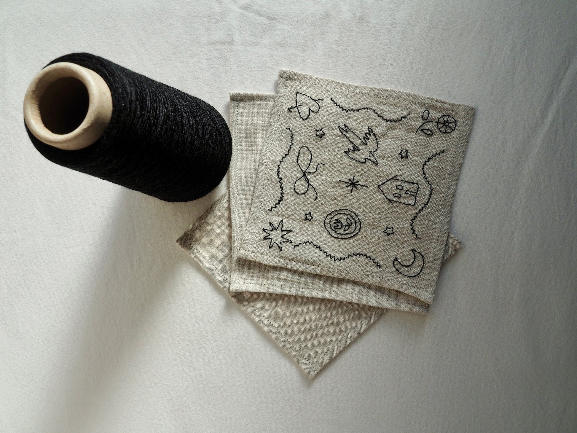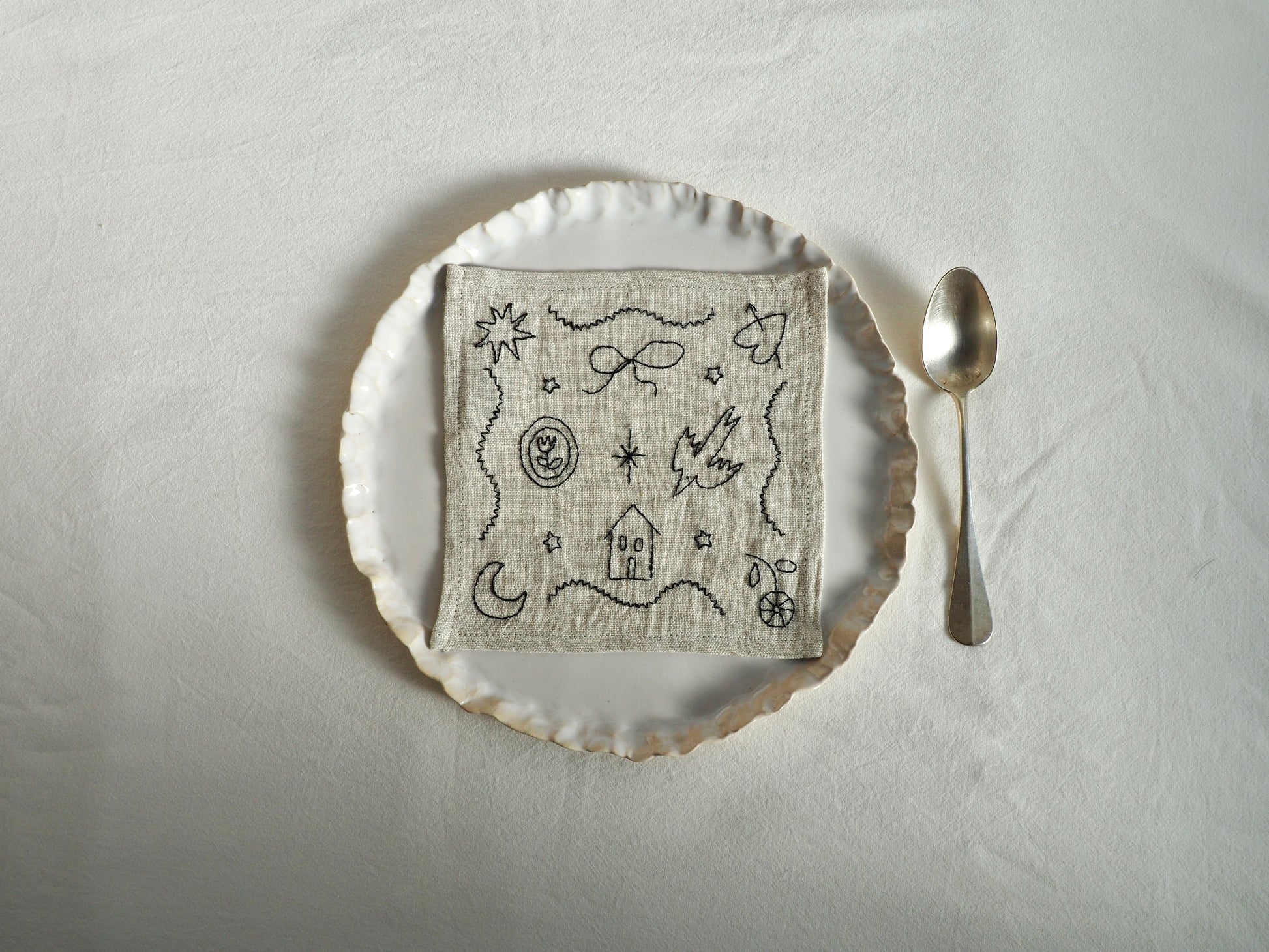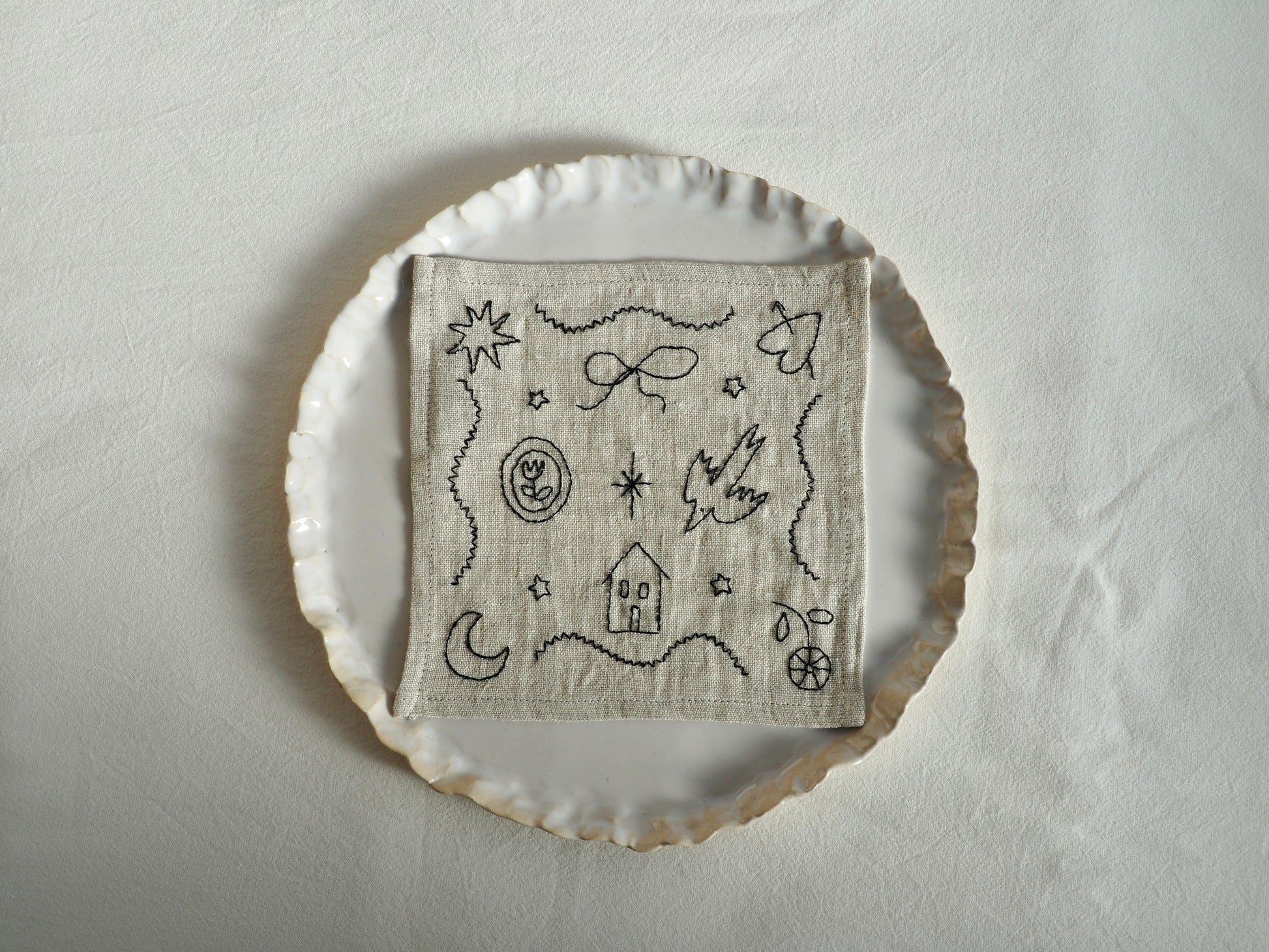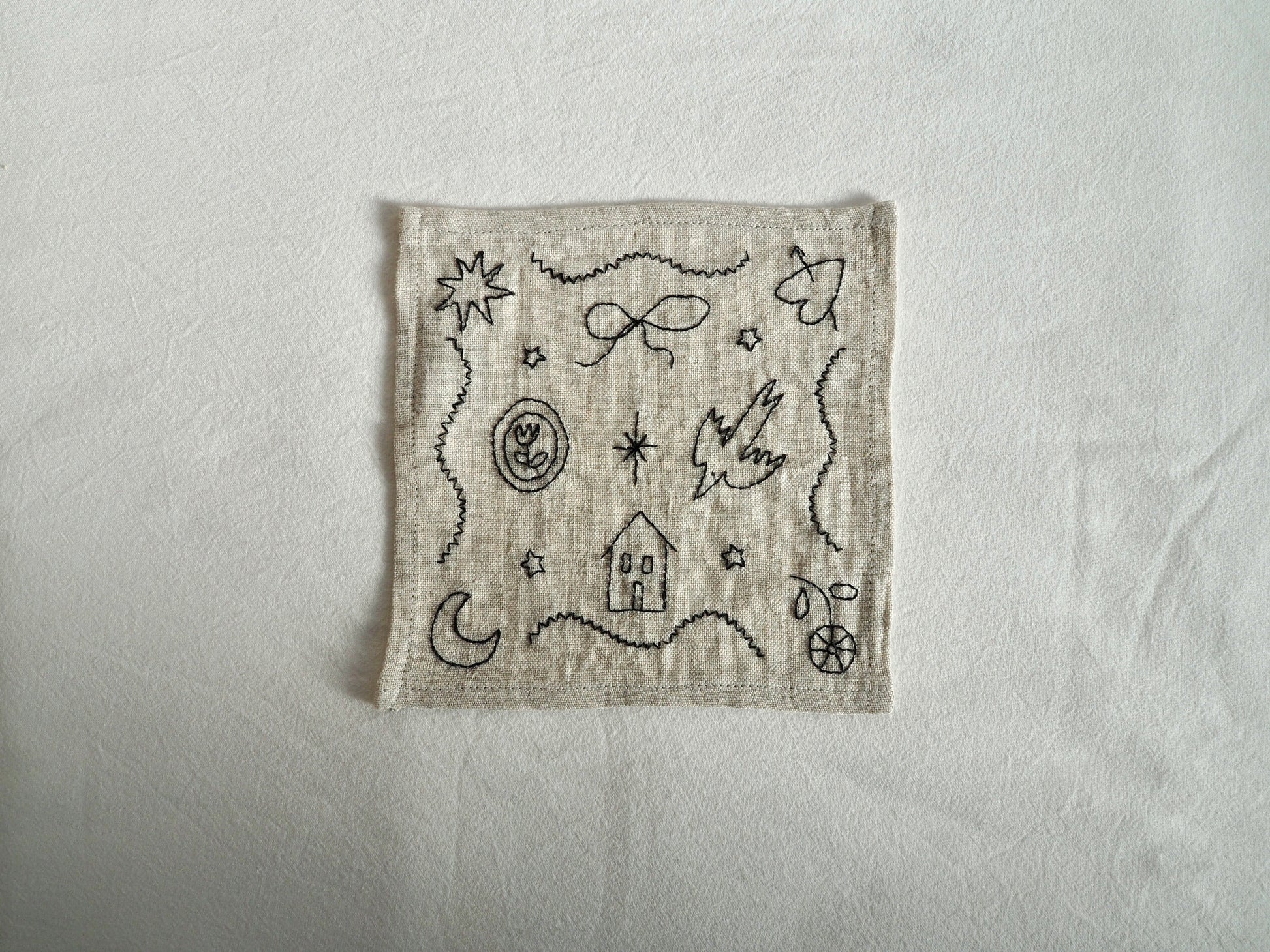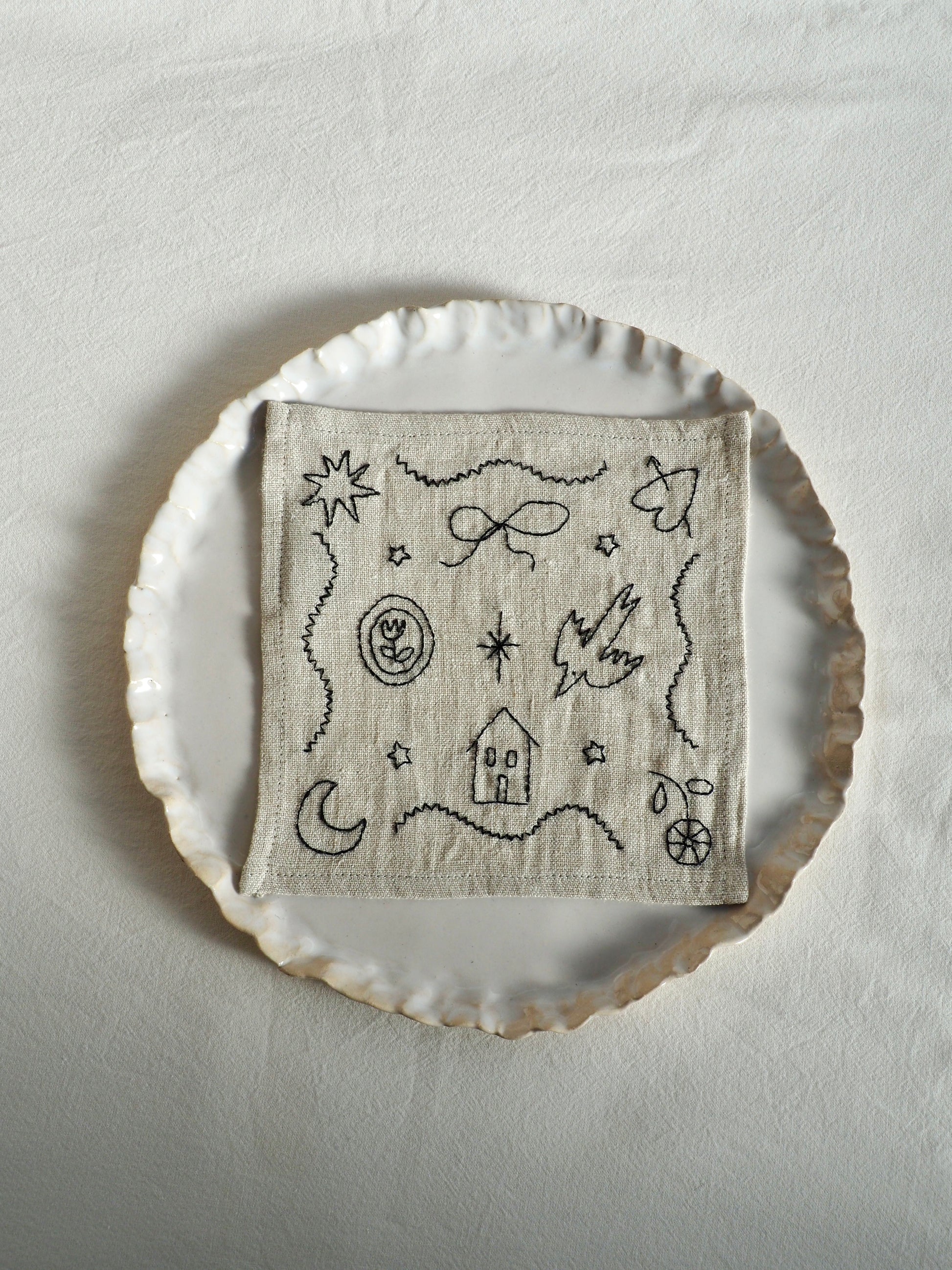 Every motif — the tiny stars, the house, the bird, the quiet shapes wandering across the fabric — is drawn freehand and then translated into embroidery, so no two napkins are ever exactly the same.